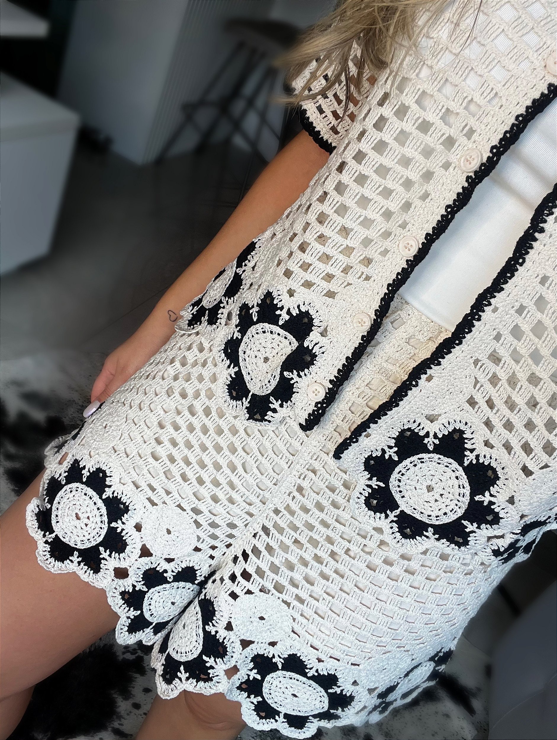 Shorts curto confeccionado em crochet. Apresenta cós com elástico, proporcionando conforto ao vestir, forro e detalhe de flores coloridas na barra do shorts. Uma peça delicada, confortável e versátil, perfeita para dias de verão.